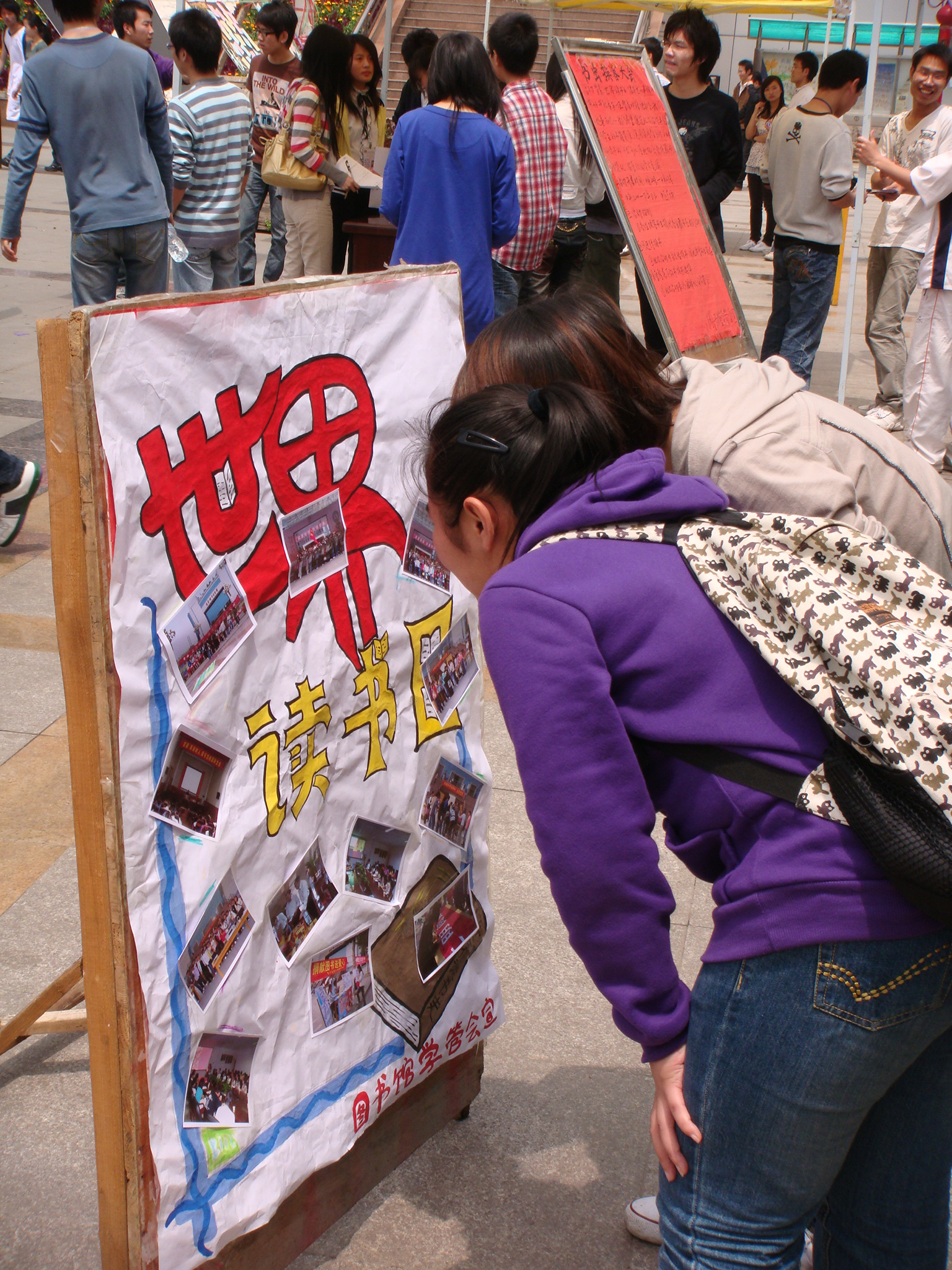 4月20日,中区广场上彩带飘飘、掌声阵阵。学管会举办的第二届“世界读书日”活动正式拉开序幕,图书馆学管会将在这里举行为期二周的题为“让读书成为悦读”系列活动。