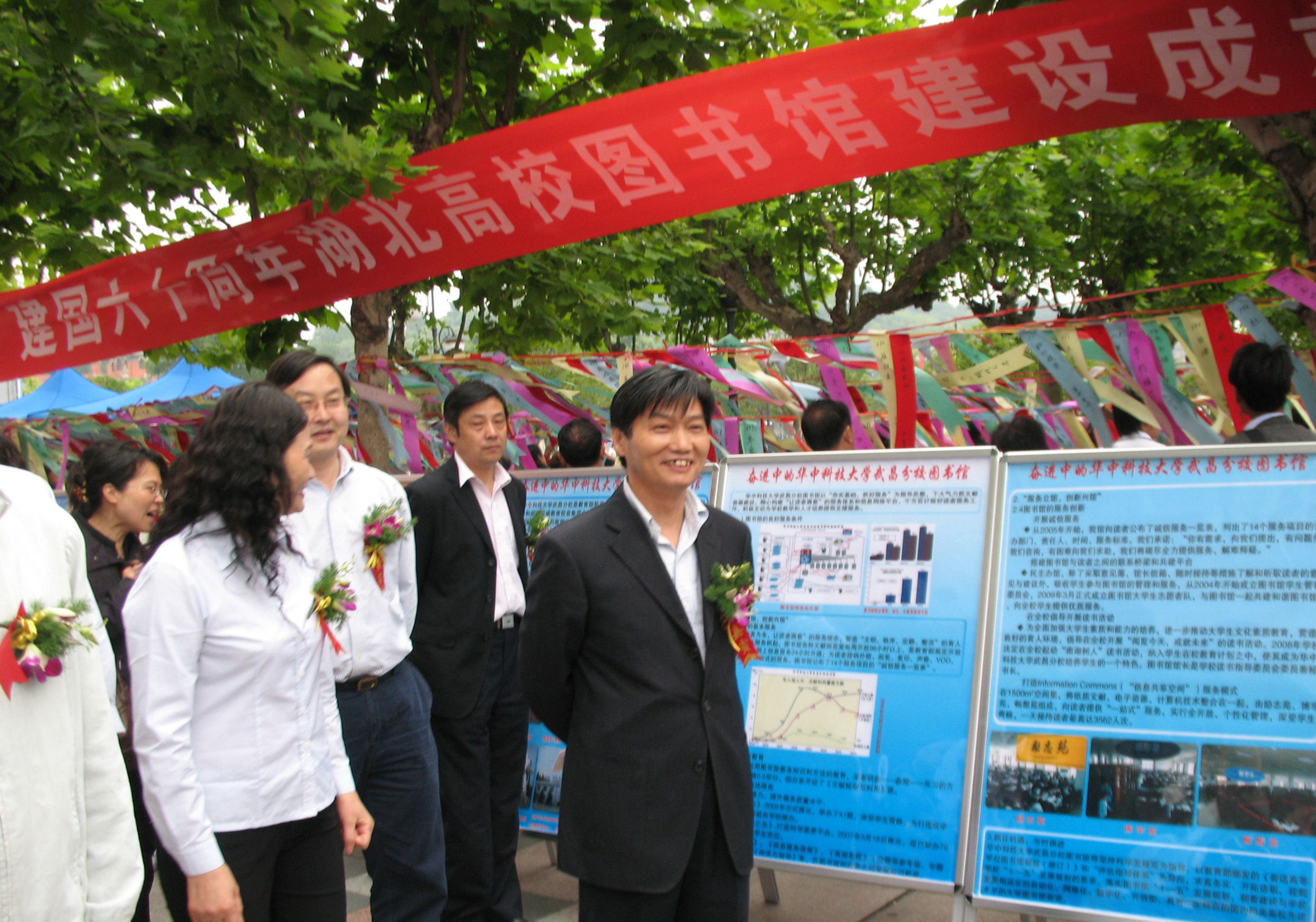 湖北省文化厅、湖北省图书馆学会、湖北省高校图工委的领导参观我校图书馆展板
