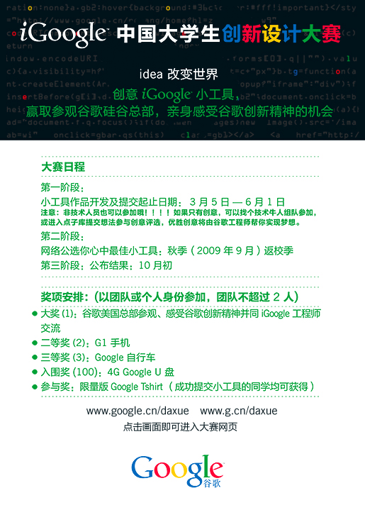 “iGoogle中国大学生创新设计大赛”面向全国 2700 万大学生。3 月 5 日至6 月 1 日,大赛进入第一阶段,即基于iGoogle平台的小工具(Gadget)大赛,参赛的大学生可以向谷歌中国提交已开发的小工具,如果你有创意却不懂技术,可以邀请技术高手帮忙,也可以向iGoogle 大赛的点子库提交创意,通过评选的优胜创意将由谷歌工程师完成开发。第二阶段,10 月初至10月中旬,按照比赛规则和评选标准,谷歌中国将决出最终的获奖作品,参赛者开发的小工具的网民使用率是评选的重要标准之一。