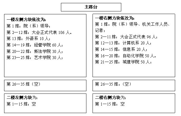 邀请各院(系)院长、主任、副主任参加,全体学生管理人员及学生代表。9:50分进场完毕。