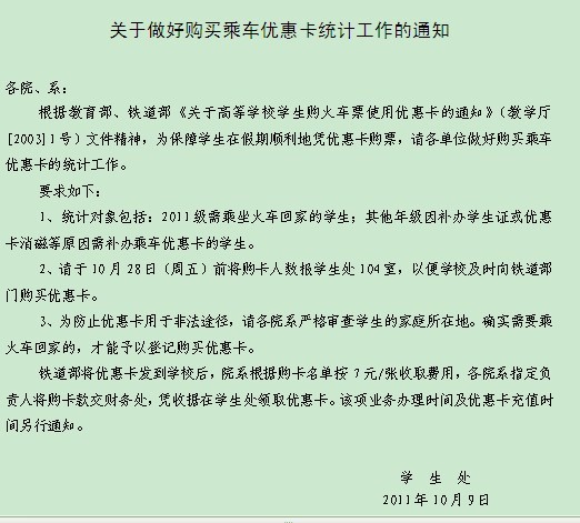 文件下载:学工部红头[2011]5号(关于做好购买乘车优惠卡统计工作的通知)