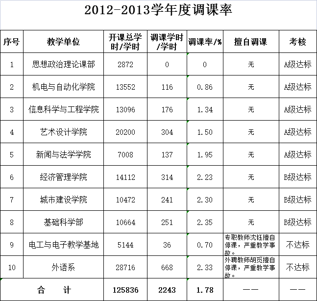 1.开课总学时为2012-2013学年度全部理论课、实验和上机总学时(不包括毕业设计/实习、课程设计、大学体育等实践教学环节);调课学时为调课单上计入调课的总学时。