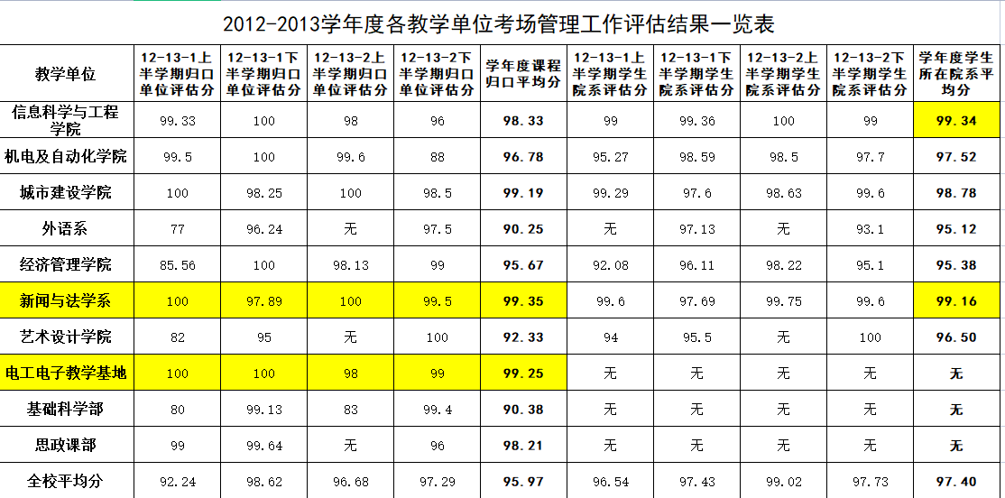 (更新)2012-2013学年度各教学单位考场管理工作评估结果一览表