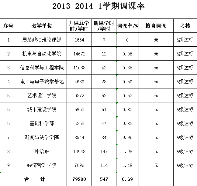 1.“开课总学时”为2013-2014-1学期各开课单位全部理论课、实验和上机总学时(不包括毕业设计/实习、课程设计、大学体育等实践教学环节);“调课学时”为各开课单位非正常调课的总学时。