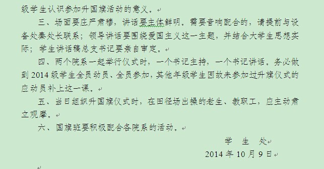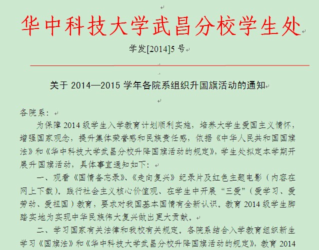 下载文件:学发[2014]5号(关于2014—2015学年各院系组织升国旗活动的通知)