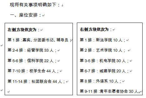 二、要求: 1. 各单位于18:45前入场完毕,并按指定位置就座。 2. 请自觉遵守和维护会场纪律。 校团委 2014-11-5