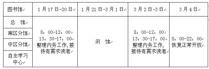 闭馆期间学校18号教学楼自习室开放,开放时间:7:30—22:00,有需要的读者可前往自习;图书馆网上电子资源照常开放,2015年3月4日起图书馆恢复正常开放。
