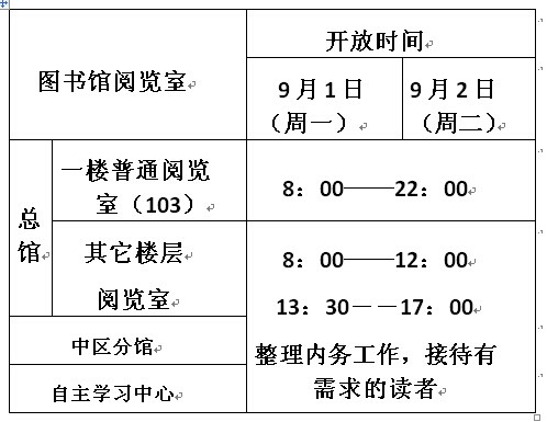 9月1号-2号,图书馆开放时间安排如下: