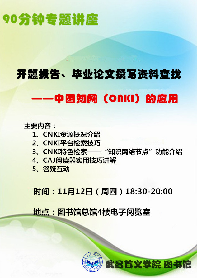 图书馆90分钟专题讲座:开题报告、毕业论文撰写资料查找——中国知网(CNKI)的应用
