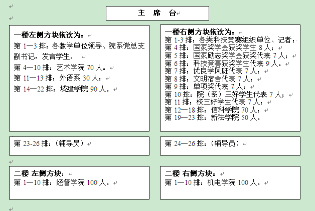 邀请各教学单位领导参加,全体学生管理人员,获奖学生及学生代表。2:15分进场完毕。