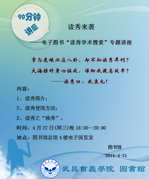 图书馆90分钟专题讲座:电子书读秀学术搜索