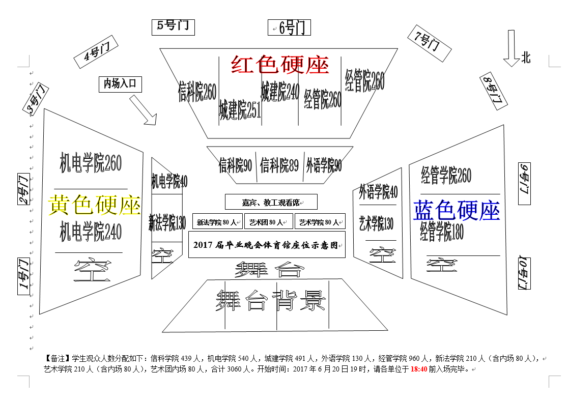 2017届毕业典礼及文艺晚会定于6月20日(周二)晚19:00在体育馆举行,为保证晚会安全圆满进行,现将有关事宜明确如下: