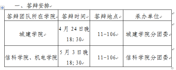 四、相关要求:请各学院分团委通知学生认真准备答辩相关工作,积极组织学生观摩答辩活动,并于中期答辩结束后将《大学生创新创业训练计划项目中期检查报告》纸质档及电子档以及答辩PPT电子文档交至校团委(行政楼109室)。