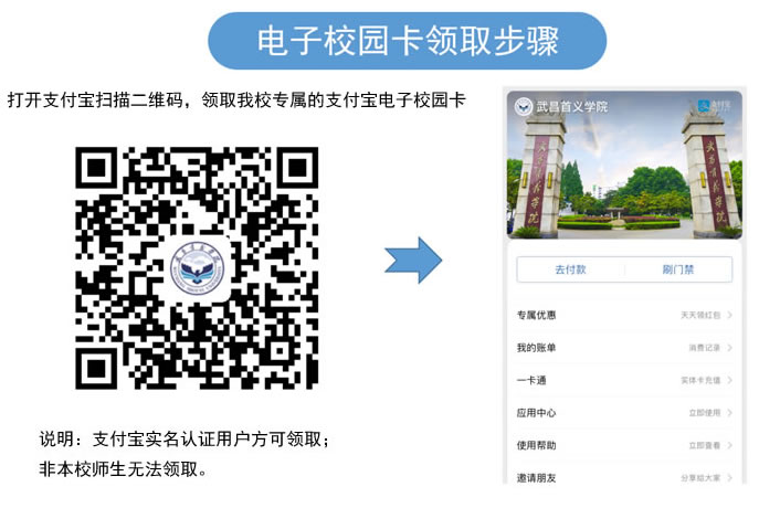 1、我校师生可自愿扫描二维码领取支付宝“电子校园卡”,从而获取武昌首义学院支付宝“电子校园卡”专属校园身份,领取成功后,电子卡自动收纳在支付宝“卡包”里。可进行账单查询、一卡通充值及后续推出的一些拓展应用的使用。