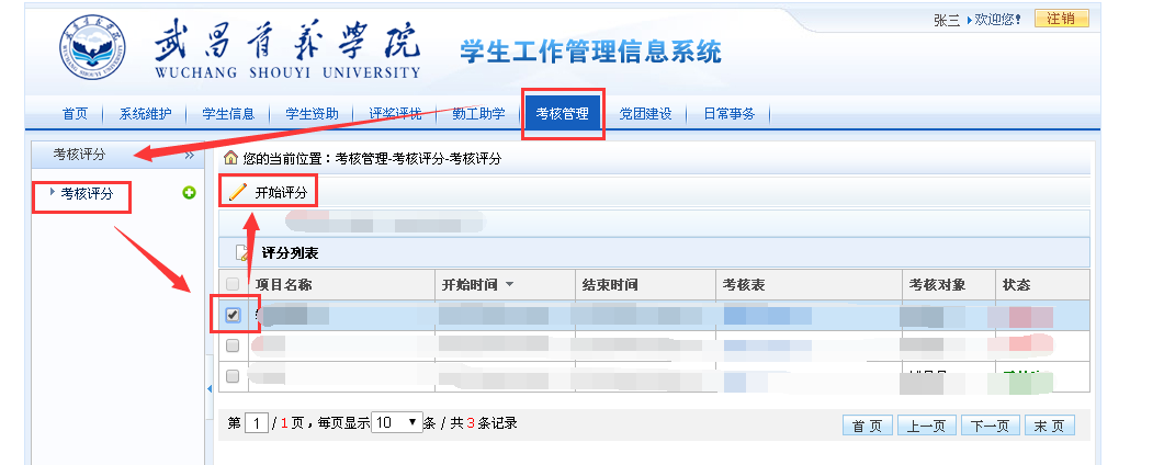 三、在【考核管理】模块下单击【考核评分】项目,勾选项目名称后点击开始评分,如下图所示;