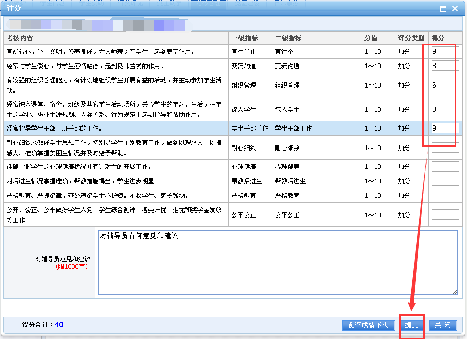 四、勾选所属辅导员开始进行评分,根据各考核内容输入分值范围内分数(如对辅导员有建议可在评分栏下文本框中输入),并点击提交按钮,此次评分完成,如下图所示;