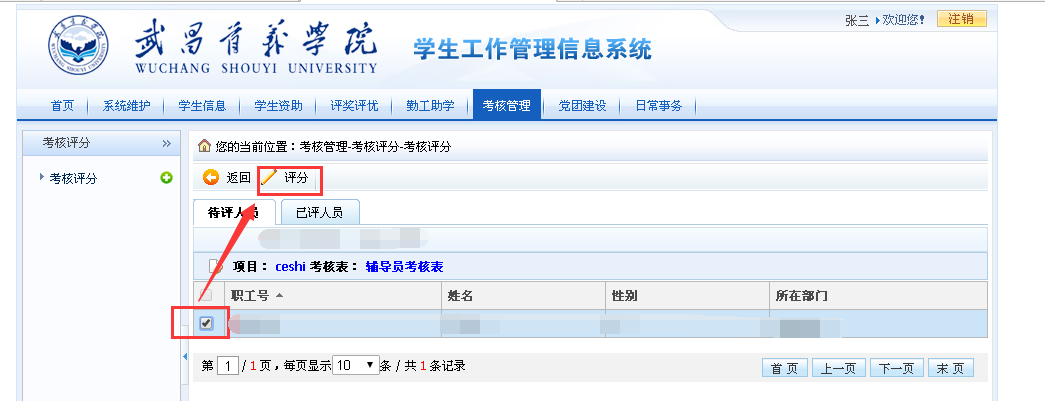 三、在【考核管理】模块下单击【考核评分】项目,勾选项目名称后点击开始评分,如下图所示;