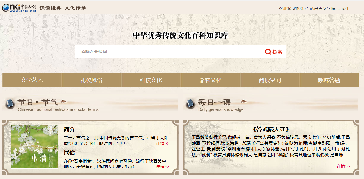 数据库连接地址:从图书馆主页“资源”下面的“专业数据库”栏目中的“中华优秀传统文化百科知识库(试用)”进入或通过数据库网址进入ctwh.cnki.net