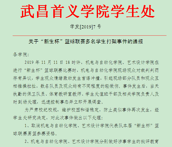 关于“新生杯”篮球联赛多名学生打架事件的通报