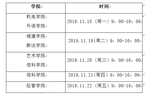 一、按照计划免疫程序,校医院定于2019年11月18日至2019年11月22日每天9:00-16:00进行疫苗第二针接种工作,现将各学院接种时间安排如下,请各学院按时间安排到校医院进行接种。