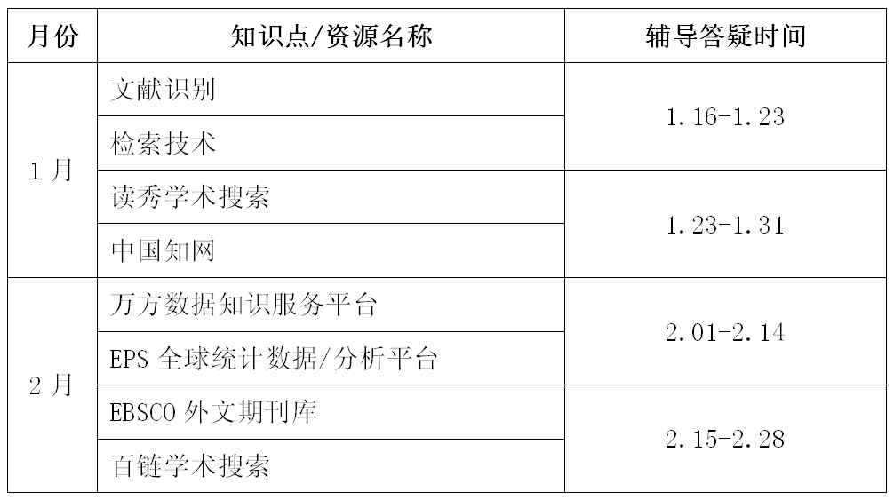 培训分为两个阶段:第一阶段(1-5月)培训国内外数据库的使用方法;第二阶段(7-8月)培训课题检索分析及检索报告撰写。图书馆将在每个月初公布本月具体培训内容。