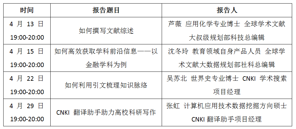 本讲座主要面向各校师生,就选题挖掘,前沿追踪,学术翻译,论文撰写等话题深入展开讨论,全方位助力师生科研写作能力提升。课程安排如下: