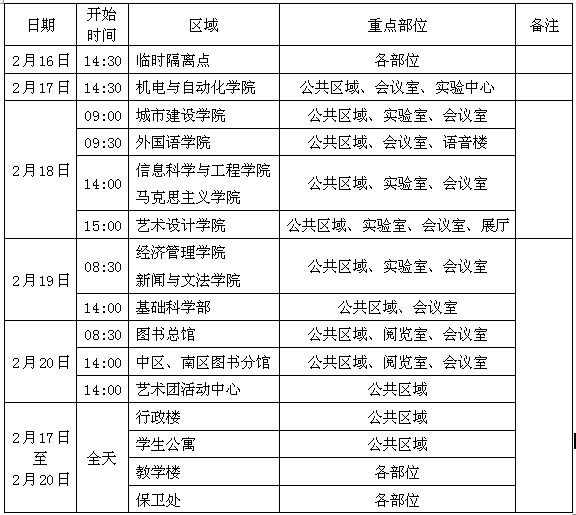2.经与各相关部门协商,全校外场以及各楼栋公共部分,各院部重点场所的消杀安排为: