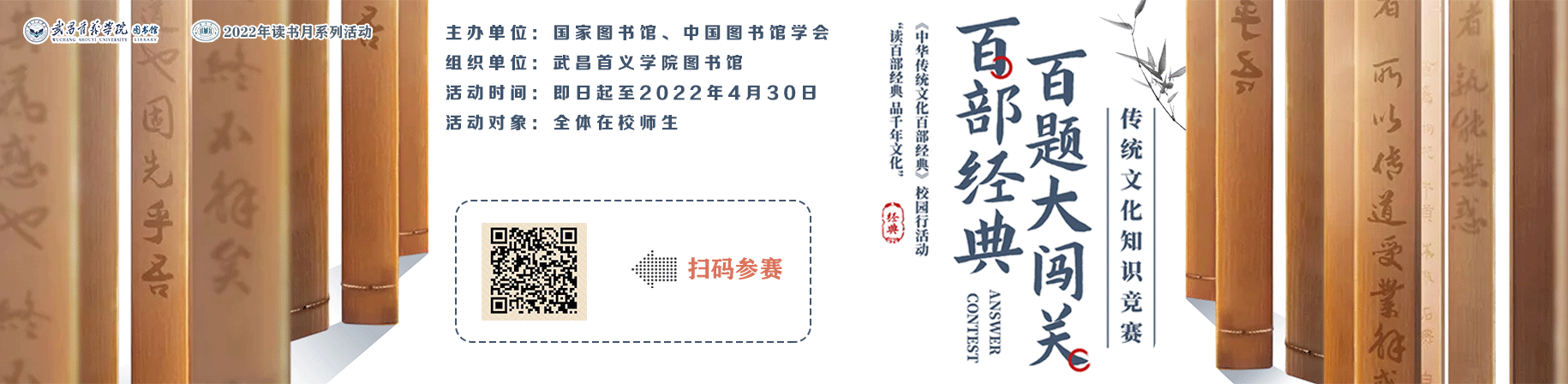中华优秀传统文化是中华民族的重要文化软实力,为中华民族发展提供强大的精神力量。为提升大学生群体对中华传统文化的理解和认知,更好地继承和弘扬优秀传统文化,培养我校学生经典阅读习惯,提升对传统典籍的理解,图书馆在读书月期间推出“百部经典·百题大闯关”传统文化知识竞赛活动。