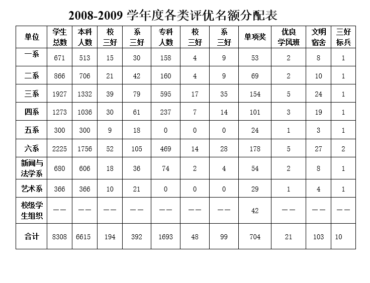 附件:《2008-2009学年度各类评优名额分配表》