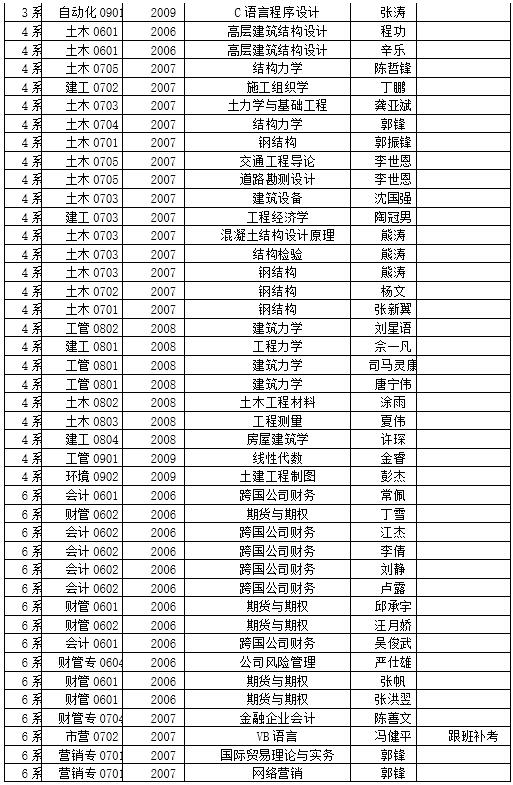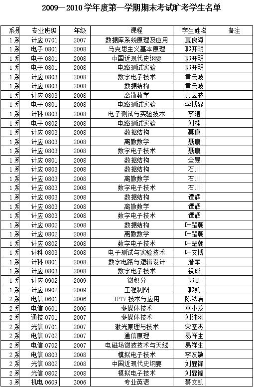 2009-2010学年第一学期期末考试已于22周星期五(2010年1月29日)结束。为严肃考场纪律,搞好考风建设,本次期末考试学校组织了以各系领导、校教学顾问委员会成员及教务处人员组成的7个考场评估组到考场进行评估,并由校机关27位干部组成巡视组到考场进行了为期一周的考场巡视。从检查的情况看,本次期末考试整体情况良好,但学生无故旷考情况较为严重。根据校长办公会议精神,学校决定对本学期期末考试无故旷考的学生给予全校通报批评,具体名单如下: