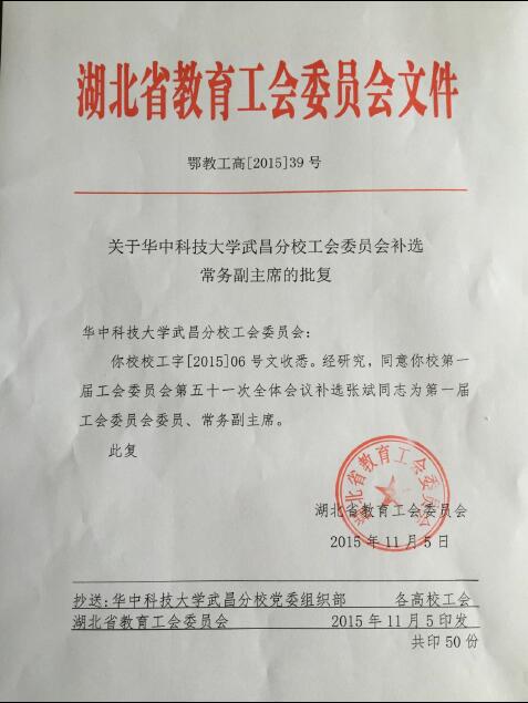 附件:《关于华中科技大学武昌分校工会委员会补选常务副主席的批复》(鄂教工高〔2015〕39号)
