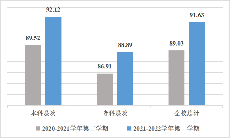 根据《武昌首义学院教师评学实施办法》,本次评学分“到课情况”“预复习情况”“学习自主性”“学习氛围”“课堂纪律”“学习方法及效率”“教学内容理解与掌握”“作业完成”“综合素质”及“总体评价”等十个评价指标,每个指标分数占比10%。任课教师对各教学班的学习状况进行评价,各行政班评学得分取所在教学班评学得分的平均分。全校评学均分91.63分,其中本科班级均分92.12分,专科班级均分88.89分。相较于上学期教师评学结果,本学期评学成绩提升,本科班级学生学习状况较专科好。具体情况如下: