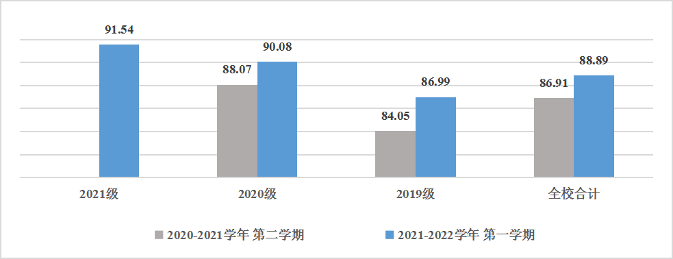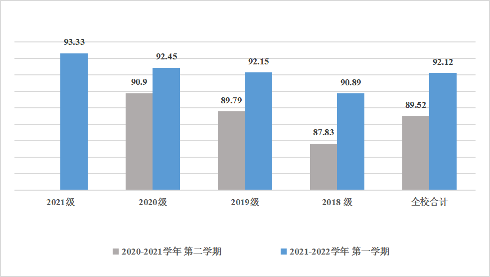 全校被评456个本科行政班级的评学平均分为92.12分。通过对大一到大四评学结果对比分析显示,本科层次班级中2021级教师评学均分相对最高,2018级(专升本2020级)教师评学均分相对最低。对比上学期本科层次教师评学结果进行分析,各年级均分均有不同程度的提升,需重点关注2018级(专升本2020级)学生的学习状态,具体情况如下: