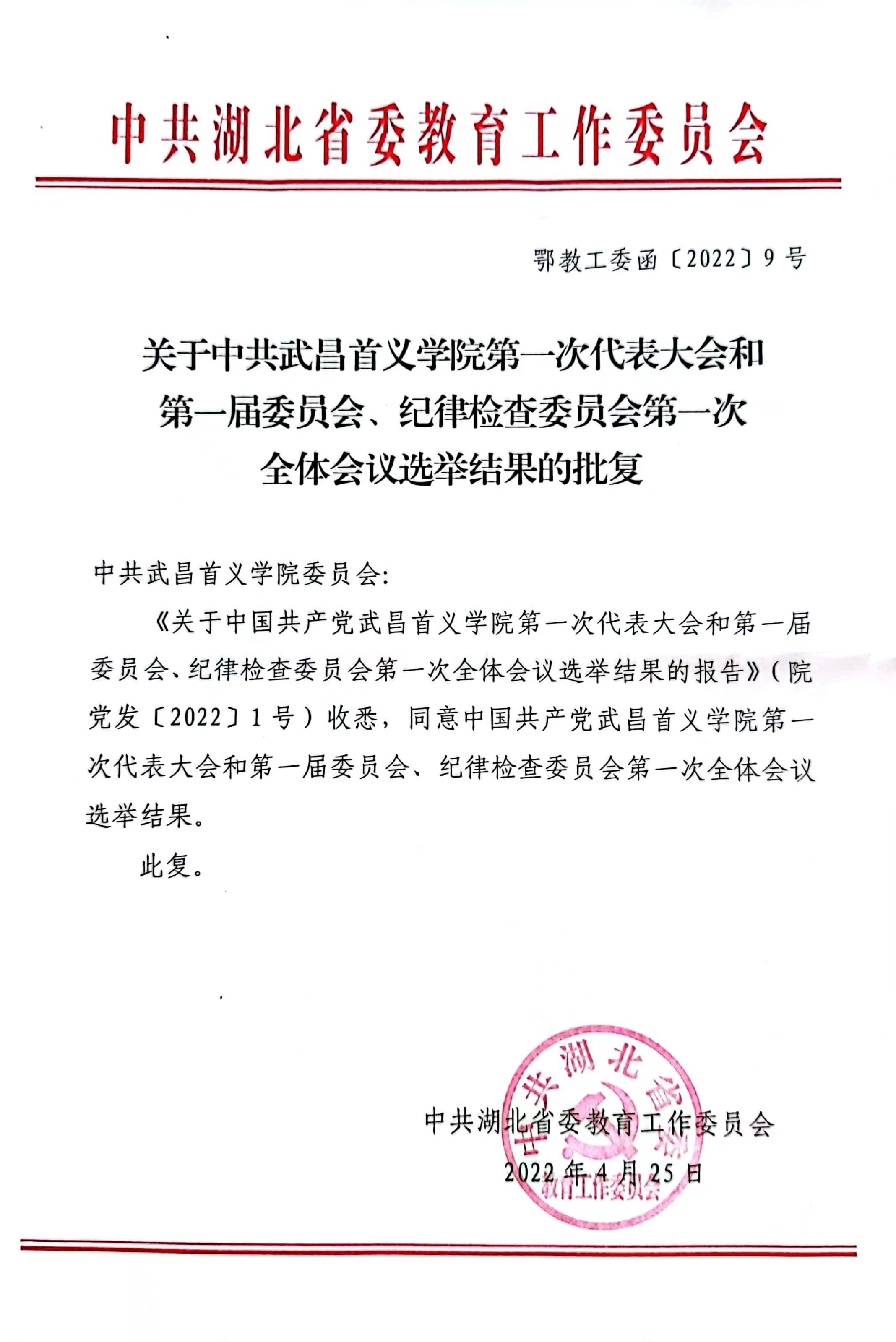 现将中共湖北省委教育工作委员会《关于中共武昌首义学院第一次代表大会和第一届委员会、纪律检查委员会第一次全体会议选举结果的批复》(鄂教工委函〔2022〕9号)予以转发。