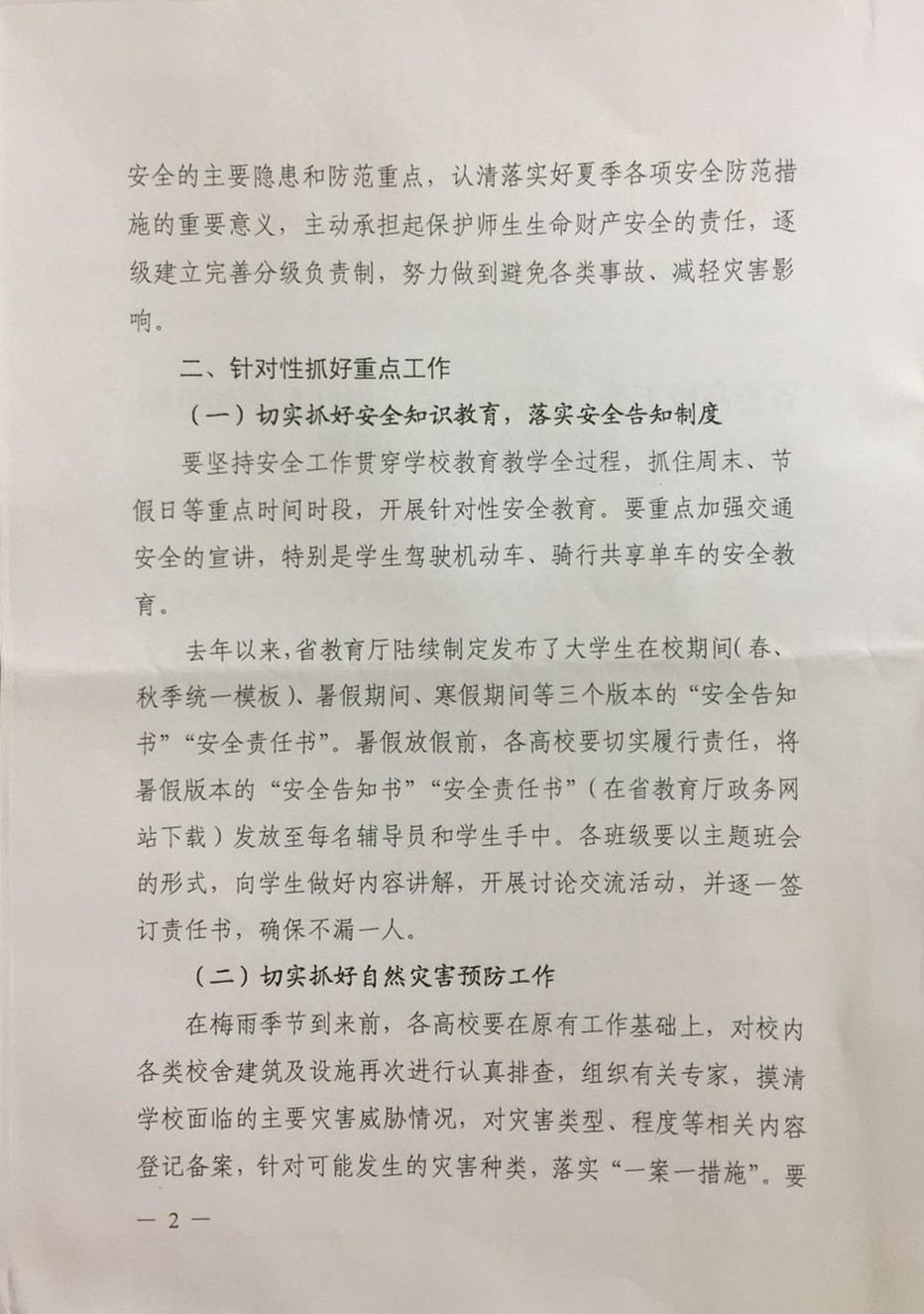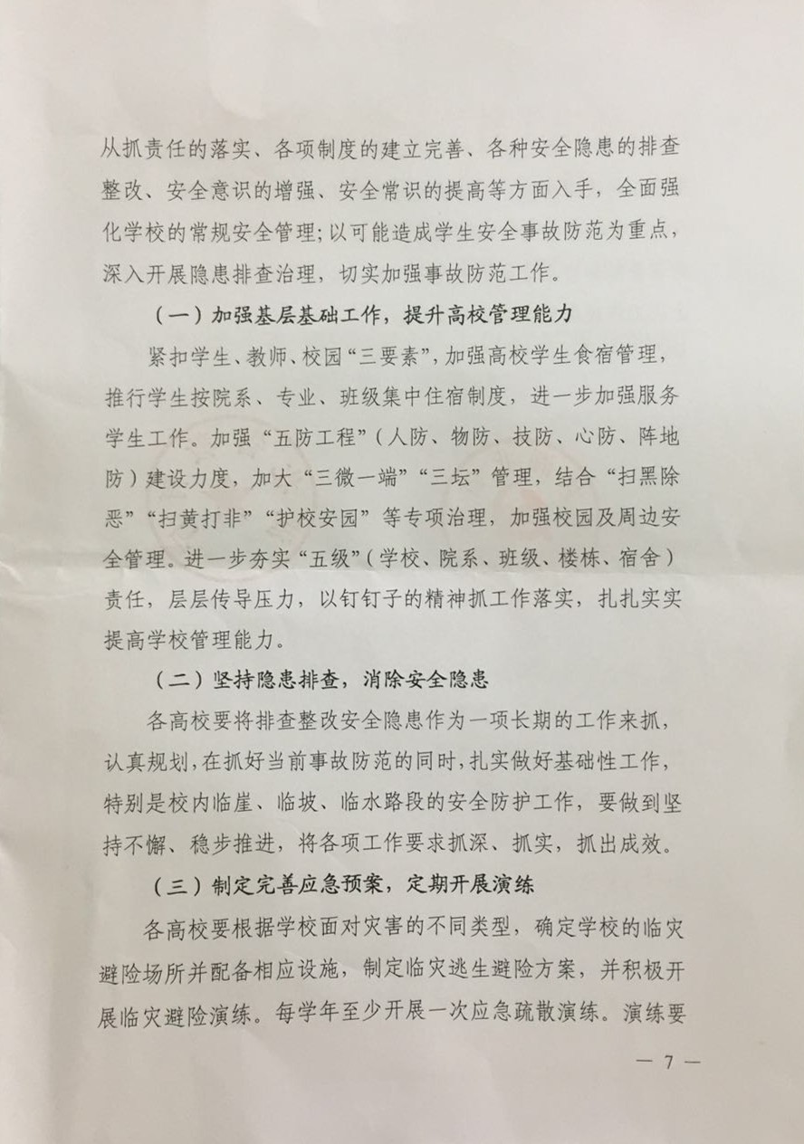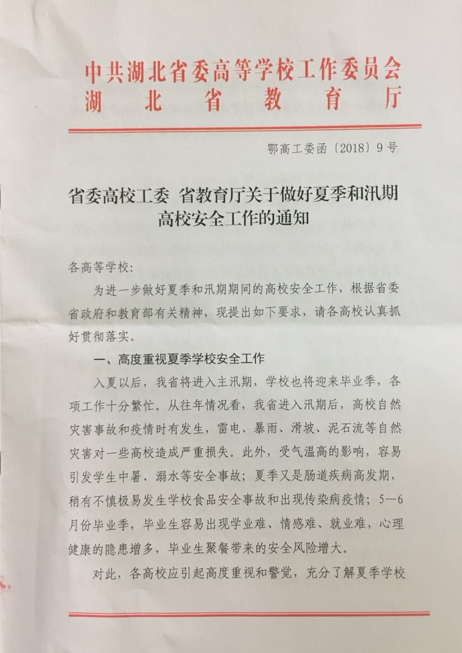 现将《省委高校工委、省教育厅关于做好夏季和汛期高校安全工作的通知》文件予以转发,请各单位认真落实文件精神,按照文件要求做好夏季和汛期期间的校园安全工作,消除安全隐患,制定完善应急预案,定期开展演练。